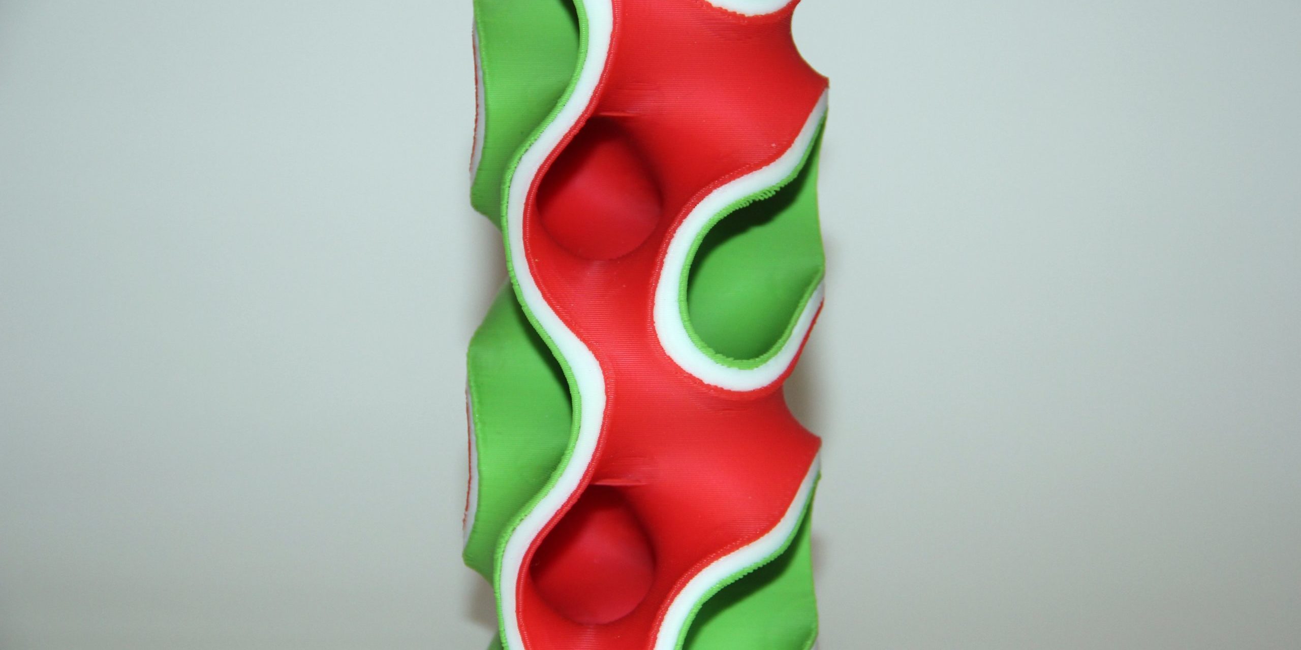 Die ersten 3D-gedruckten piezoelektrischen Funktionsmuster sind dreischichtige Flächenwandler aus dem piezoelektrischen Polymer PVDF (Polyvinylidenfluorid). Die mitgedruckten Elektroden bestehen aus mit Graphen angereichertem PVDF. Zwischen ihnen entsteht das zum Wandlerbetrieb erforderliche elektrische Feld. Auch bestehen die Zuleitungen und die Anschlüsse aus diesem Materialsystem. Der 3D-Druck erfolgte auf Basis des Fused Deposition Modeling (FDM-Verfahren). Die Polarisierung der piezoelektrischen Schicht erfolgt mit einer Feldstärke von etwa 15 MV/m in einem zweiten Prozess. Bei Bedarf lässt sich auch ein elektrisch isolierendes Gehäuse aus dem Polymer PLA (Polylactid) drucken. Diese ersten Druckerzeugnisse belegen nur die grundsätzliche Herstellbarkeit von Piezowandlern durch die additive Fertigung, noch nicht die Realisierung leistungsangepasster Wandler. Das erfolgt in einem weiteren Entwicklungsschritt, bei dem hoch-komplexe Wandlertopologien, wie z. B. gyroid-ähnliche Strukturen, im Fokus stehen. Sie sollen eine Alternative zu den konventionellen Stapel-Bauweisen wahrnehmen. Für die strukturdynamische Anpassung stehen mehrere Auslegungsparameter zur Verfügung: die Periodenlänge (Gitterkonstante) der dreifach-periodischen Bauweise, die Dicke der gyroidalen Membrane und auch die Ausführung als mehrschichtige Stegform.
