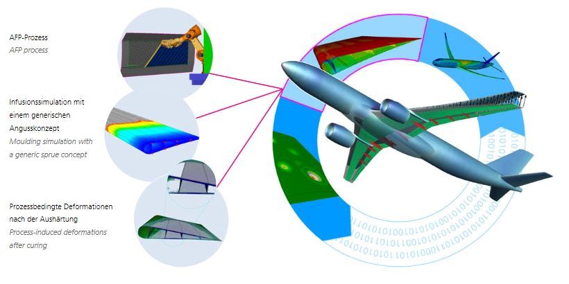 Die simulative Fertigung der Steuerfläche umfasst einen Automated Fibre Placement (AFP)-Prozess trockener Fasern der Außenschalen, die Infusion der Halbzeuge und eine anschließende Aushärtung. Die Fertigung gehört gerade bei Faserverbunden zum Leben des Produkts. So lassen sich bestimmte Abweichungen vom Idealzustand doppelt gekrümmter Strukturen technologiebedingt zwar nicht vollständig vermeiden, jedoch minimieren. Die Abschwächungsfaktoren für Steifigkeiten und Festigkeiten sowie eine konkrete Überprüfung des resultierenden Strukturverhaltens im Auslegungsprozess können diese unvermeidbaren Effekte berücksichtigen. Als nächster Schritt schließt sich die Infusion der Struktur an. Die Simulation sagt den Fortschritt der Fließfront durch das Bauteil voraus. Die Nutzung schneller Ansätze ermögtlicht die Untersuchung verschiedener Angusskonzepte auf die Güte der Infusion und die Ermittlung potenzieller Fehlstellen. Anschließend erfolgt die Aushärtung und eine Vorhersage prozessbedingter Verformungen und Eigenspannungen durch thermische und chemische Vorgänge. Die Verknüpfung der Handhabungs- und Produktionsschritte in einer virtuellen Fabrik erlaubt eine Abschätzung der Fertigungskosten und des ökologischen Fußabdrucks.