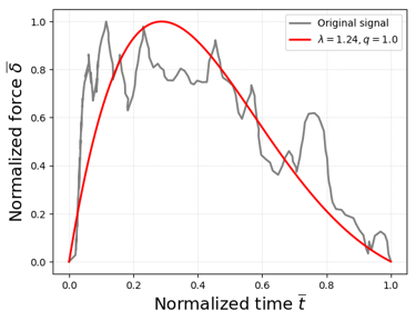 Das Ergebnis ist eine charakteristische Kraft-Zeit-Kurve (siehe Abbildung 1b), welche die Nachgiebigkeit des Projektils unter Schlagbeanspruchung beschreibt. Sie lässt sich direkt aus dem gemessenen oder simulierten Kontaktkraftzeitverlauf ableiten. Die resultierende Kurve ist entweder konstant (Starrkörper) oder eine zeitvariante Sigmoidfunktion. Diese Modifikation erlaubt eine Berechnung von zeitvarianten Kraftverläufen mit sich zerstörenden Projektilen mit den Grundgleichungen des Kontaktgesetzes.