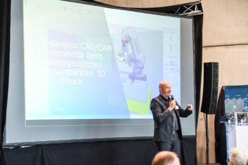 At the EmpowerAX Days on 4 + 5 October 2022, the members of the Innovation Lab addressed these questions together with Composite United e.V., potential technology users and other important players in the industry. The location underlined the usefulness of the discussion: on the left a 3D printing robot, on the right the carbon rib structure of an aircraft wind turbine and at the front of the stage exciting presentations on the current state of fibre-reinforced 3D printing in industry and research. During the breaks, the 60 or so participants were able to admire the current activities of the players in this field in the exhibition and talk to them. From suppliers for aircraft construction, to providers of the latest material combinations for printing, to print heads and finished components, a comprehensive insight was offered.