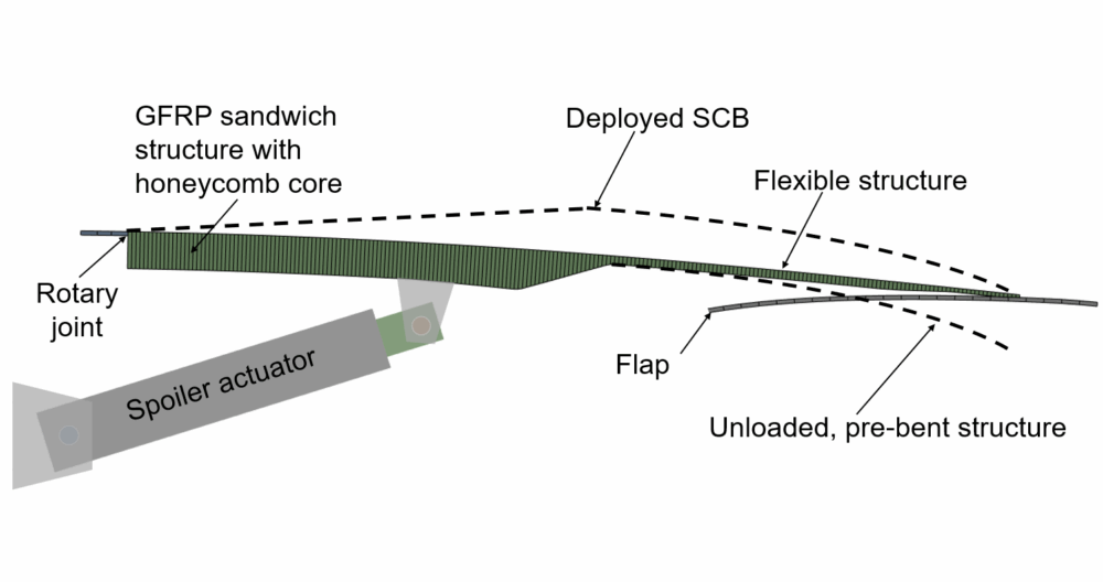 In morphing, structures are designed to vary in shape in order to actively change their form and thus adapt to aerodynamic conditions. The spoiler is a particularly interesting component for morphing applications because it is already an adaptive system with an actuator. With the solution of a structural pre-bending of the spoiler, an SCB can be formed as soon as the actuator extends a bit. Meanwhile, the pre-bending keeps the trailing edge of the spoiler on the landing flap. As no additional actuator is required for this concept, it is referred to as a single-actuator concept according to Künnecke (2022) et al. ( 2022) According to Goerttler (2024), the above-mentioned fuel reductions can be achieved with this concept.