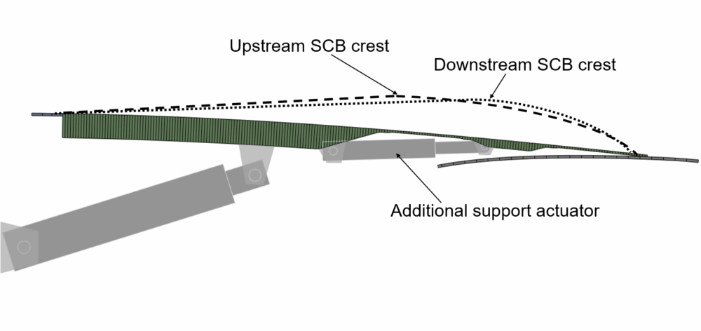 According to Künnecke et al. (2023), (2023) an additional support actuator can be used to adapt the SCB to the changing environmental conditions and the resulting change in shock position. For this purpose, precise control of the bump crest position can be achieved with a combination of just two actuators in series and a pre-bent spoiler structure, which limits the additional complexity of this system. However, if the installation space for a second conventional actuator is not sufficient Künnecke (2024) suggest that the support actuator can be designed as a shape memory alloy. These are characterised by their large reversible elongation so that they can develop high forces with comparatively small cross-sections. Such actuators can therefore be designed to save space, which makes them an attractive solution for problems with limited installation space.