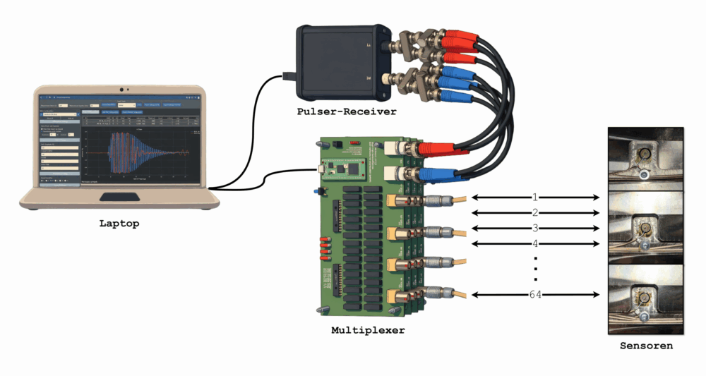 In the designing process of the measurement system, the focus was on in-house development and modularity. Software is developed in-house, enabling seamless integration of new algorithms and output formats, such as automated real-time provision of processed data. Similarly, the measurement hardware – sensors and multiplexers – is in-house developed, supporting large sensor counts and quick adaptation to new applications.