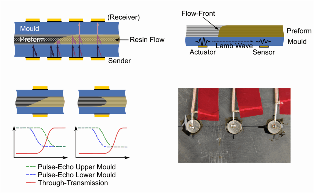 Depending on the process and complexity, resin flow cannot always be observed, for example, in closed molds or on the bottom side of thick components. Here, sensors can visualize hidden flow-fronts, providing critical insights into concealed processes. Unlike commonly used dielectric or pressure sensors, ultrasound sensors do not require direct contact with the component but are mounted on the mold’s outer surface. From there, sound signals are transmitted through the mold wall to the component, interact with it, and are then detected. Depending on the measurement method, detection can occur on the opposite or same mold half.