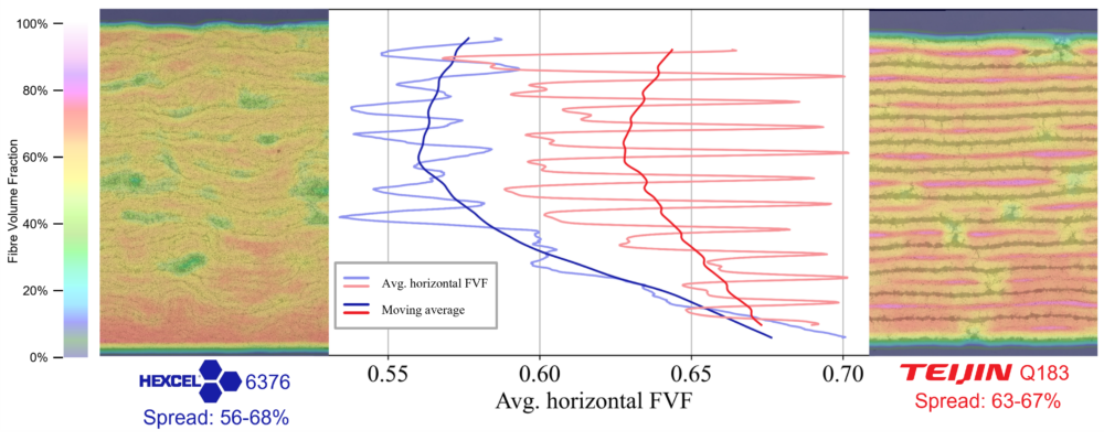 Durch die Auswertung von Schliffbildern wird das Ausmaß des Harzflusses deutlich. Ein intern entwickelter Segmentierungsalgorithmus, basierend auf Machine Learning, visualisiert den lokalen FVG in Form einer Heatmap. Die nachfolgende Abbildung stellt die beiden verwendeten Materialien bei ansonsten identischen Parametern gegenüber.