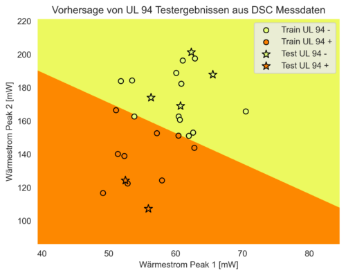 Als einfaches Brand-Screening-Verfahren dient die kombinierte thermogravimetrische Analyse (TGA) und Differenzkalorimetrie (DSC). Der Einsatz eines Probenwechslers ermöglicht die kontinuierliche Prüfung einer hohen Stückzahl an Proben, die nur geringe Abmessungen aufweisen. Als qualifizierende Brandprüfverfahren in dieser Machbarkeitsstudie kommen der UL94-Test und das Cone-Kalorimeter zum Einsatz. Ausgewählte Kennwerte, die mit diesen Messverfahren erzeugt wurden, gehen bis auf einen kleinen Teil, der zur Validierung des Modells zurückbehalten wird, als Inputdaten (TGA/DSC) und Outputdaten (UL94 und Cone) in das Modell ein. Das Modell lernt somit den Zusammenhang zwischen Input- und Outputdaten durch Anpassung der Parameter an die Trainingsdaten. Die Auswahl eines geeigneten Modells für die jeweilige Fragestellung hängt insbesondere vom Umfang der verfügbaren Daten und der Komplexität des gesuchten Zusammenhangs ab. In dieser Studie ist ein One-vs.-Rest-Klassifikationsmodell gut geeignet, um die Ergebnisse des UL94-Tests abzubilden, während ein LASSO-Modell gut geeignet ist, um die Ergebnisse des Cone-Kalorimeter-Tests vorherzusagen. In beiden Fällen handelt es sich um lineare Modelle, eines zur Klassifikation und eines für die Regression. Beide Modelle können auch bei kleineren Trainingsdatensätzen sinnvoll eingesetzt werden.
