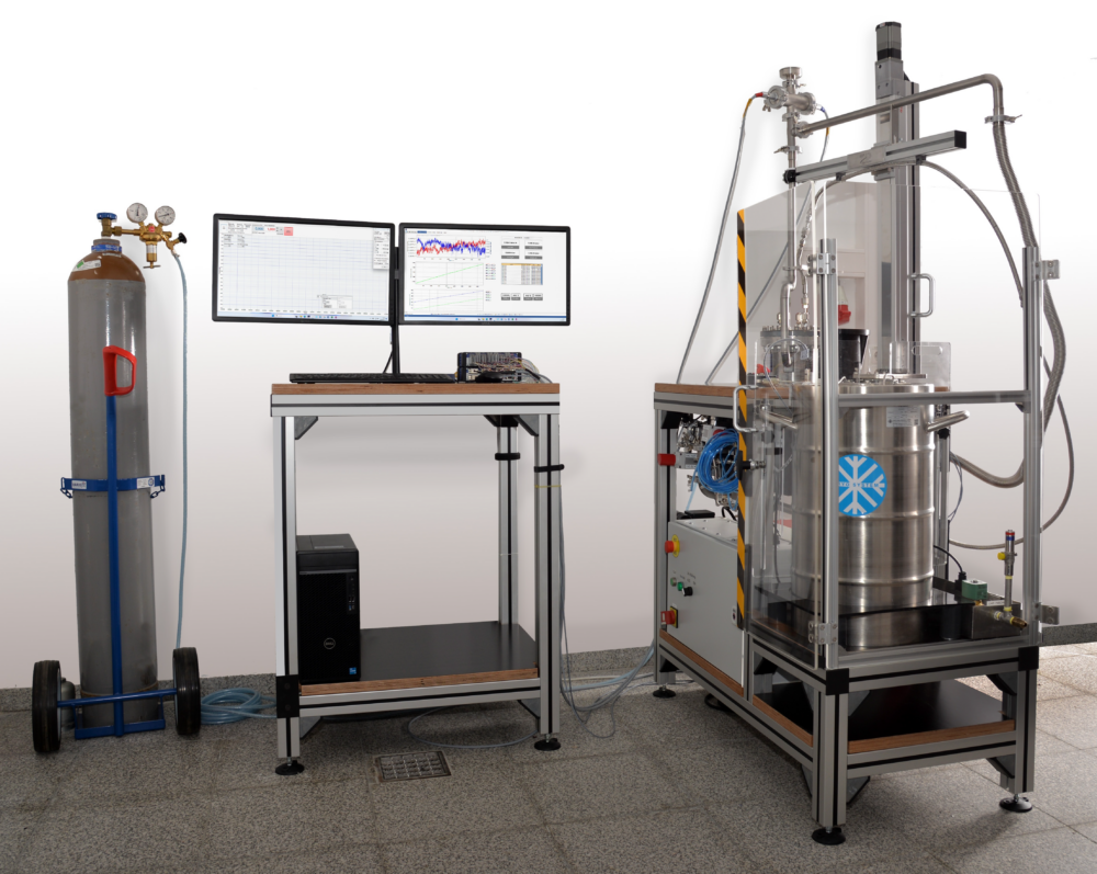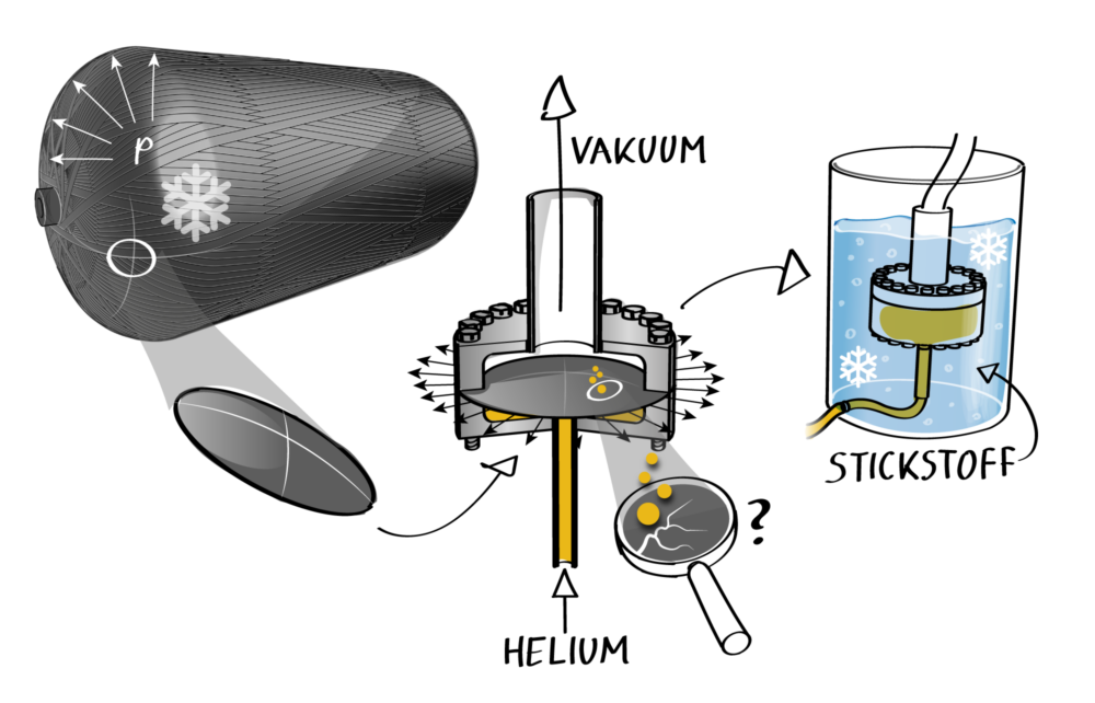 Mikrorisse und Mikrorissnetzwerke in der Tankstruktur nachzuweisen ist extrem schwierig. Mit traditionellen Methoden wie Mikroskopie oder CT-Analyse ist es oft Glückssache, die richtige Stelle zu finden. Der Bulge-Prüfstand bietet hier einen entscheidenden Vorteil. Er ermöglicht es, die Dichtigkeit von CFK-Probekörpern zuverlässig zu testen. Der Probekörper wird dazu in eine Klemmvorrichtung gespannt und auf kryogene Temperaturen abgekühlt. Dann wird Helium bei bis zu 20 bar in eine Kammer gespeist, während in der anderen Kammer Vakuum (1E-02 mbar) vorherrscht. Durch den entstehenden Druckunterschied verformt sich der Probekörper ähnlich wie in einem echten Tank. Ein Massenspektrometer misst den Helium-Leckagestrom, sobald der Probekörper undicht wird. So lassen sich die Grenzen des Materials präzise ermitteln. Der Clou ist die Verwendung von Helium als Ersatzgas für gasförmigen Wasserstoff für die Leckageerkennung und Flüssigstickstoff (LN2) als Ersatzmedium für LH2 zum Kühlen. Ähnliche Molekül- bzw. Atomgrößen und vergleichbare Siedepunkte (-253 °C vs. -196 °C) stellen eine Übertragbarkeit der Ergebnisse mit deutlich reduziertem Aufwand sicher. Mit diesem vereinfachten Vorgehen können schnell wichtige Erkenntnisse, z.B. in Hinblick auf die Bewertung der oben beschriebenen Konzepte für einen leckagefreien LH2-Tank, gewonnen werden. Die so entwickelten Lösungen müssen dann unter LH2-Bedingungen abschließend ihre Tauglichkeit nachweisen.