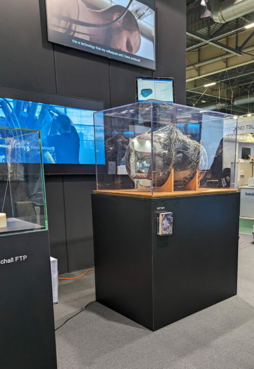 Ein geborstener Tank für den „Next Generation Train“ aus dem gleichnamigen Projekt im Zentrum des Stands fungiert als Sinnbild für viele Projekte zum Thema Wasserstoff-Tanks. Schließlich werden derzeit schrittweise Tankkonzepte für Durchmesser von 400, 1.700 und 3.000 mm unter Herstellungs- und Testgesichtspunkten untersucht. Der ausgestellte Tank ist mit Sensoren ausgestattet, die zunächst den Herstellungsprozess und dann den Zustand des Tanks während seines gesamten Lebenszyklus überwachen.