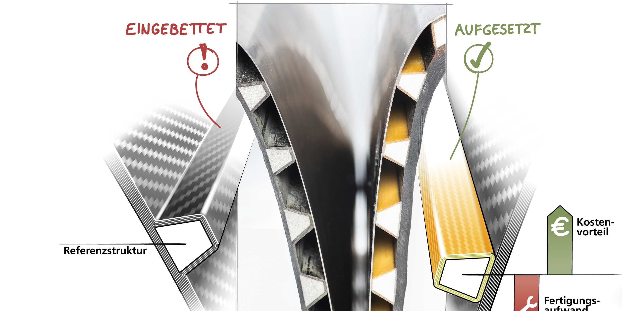 Flügelnasenstruktur mit zwischen den Hautlagen eingebettetem Schaumkern (links) und optimiertes Konzept mit aufgesetztem Stringer (rechts)