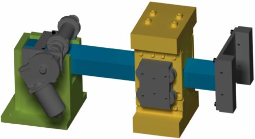 Die linke Abbildung zeigt den Prototypen des Tilgers. Die entlang des Balkens (blau) bewegliche Masse (gelb) befindet sich im Zentrum auf dem Balken. Mit dem Tilgerfuß (links, grün) wird der Tilger am Generator befestigt. Gleichzeitig ist dort der Antrieb (grau) angebracht. Nicht dargestellt ist der Antrieb mittels Zahnriemen, mit dem die Masse elektrisch automatisch verstellt werden kann