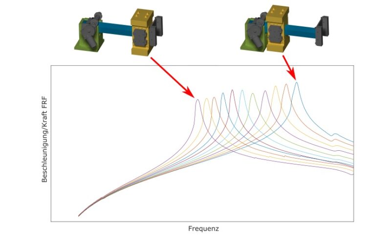 Bei der Übertragung des Tilgerkonzeptes auf die Windenergieanlage entstehen zwei Herausforderungen: Erstens ist die Tilgerfrequenz der variablen Betriebsdrehzahl nachzuführen. Zweitens treten die Schwingungen in zwei verschiedenen Raumrichtungen auf: In Drehrichtung des Rotors und senkrecht zur Drehachse nach außen. Gesucht wird daher ein Tilgeraufbau, der in zwei Raumrichtungen wirken kann und dessen Wirkungsfrequenz angepasst werden kann. Dazu wurden eine Reihe von Konzepten für die Frequenznachführung bei gleichzeitiger Wirkung in zwei Richtungen erdacht und simulativ bewertet. Eine auf einem federnden Balken verschiebbar gelagerte Masse erwies sich dabei als das passende Konzept in Bezug auf die erreichbaren Frequenzen und den Fertigungsaufwand. Die Position der Masse auf dem Balken bestimmt in diesem Konzept die Schwingungs- und damit Arbeitsfrequenz des Tilgers: Je weiter sie zur Balkenspitze wandert, desto langsamer schwingt der Tilger, also umso niedriger ist die Frequenz. Dies ist ähnlich zu einem Fadenpendel, dessen Frequenz kleiner wird, wenn die Länge des Fadens erhöht wird. Der rechteckige Balkenquerschnitt erlaubt zudem, unterschiedliche Frequenzen in den beschriebenen Richtungen zu bedämpfen, wobei die Eigenfrequenzen in beiden Richtungen mit dem Verschieben der Masse gleichzeitig verändert werden. Die Änderungen der Frequenzen sind dabei konstruktiv so zu gestalten, dass sie zu den Erfordernissen des Generators passen.