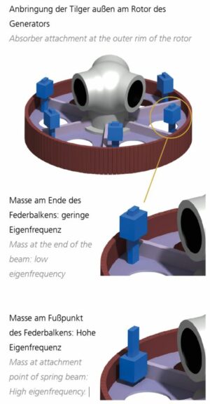 Da sich die schwingungserregenden Rastmomente im Generator prinzipbedingt nicht vermeiden lassen, muss eine andere Lösung für diese Herausforderung gefunden werden. Schwingungsreduzierende Maßnahmen direkt am Generator stellen daher eine aussichtsreiche Möglichkeit dar, den abgestrahlten Schall verringern. Eine Analyse des Schalls lieferte die Erkenntnis, dass die Frequenz, bei der der Schall auftritt, ein Vielfaches der Rotordrehfrequenz ist. Eine einfache und effektive Möglichkeit, eine solche Schwingung zu reduzieren, stellen Schwingungstilger dar. Dabei handelt es sich um zusätzliche schwingungsfähige FederMasse-Systeme, deren Wirkung darin besteht, die Schwingung aus der zu beruhigenden Grundstruktur in sich selbst zu verlegen, wo die Schwingung erstens nicht stört und zweitens